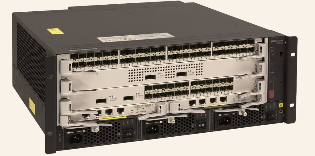 核心使用 华为S7703 ES0Z1B03ACS0 双引擎核心交换机,该交换机基于华为公司智能多层交换的技术理念,在提供稳定、可靠、安全的高性能L2~L4层交换服务基础上,进一步提供MPLS 、业务流分析、完善的H-QoS策略、可控组播、资源负载均衡、一体化安全等智能业务优化手段,同时具备超强扩展性和可靠性。
